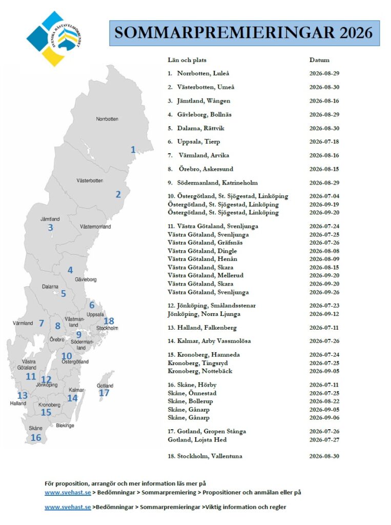 Nu har SH - Svenska Hästavelsförbundet publicerat datum och platser för de kommande sommarpremieringarna under 2026. Mer info finns att läsa på deras hemsida.